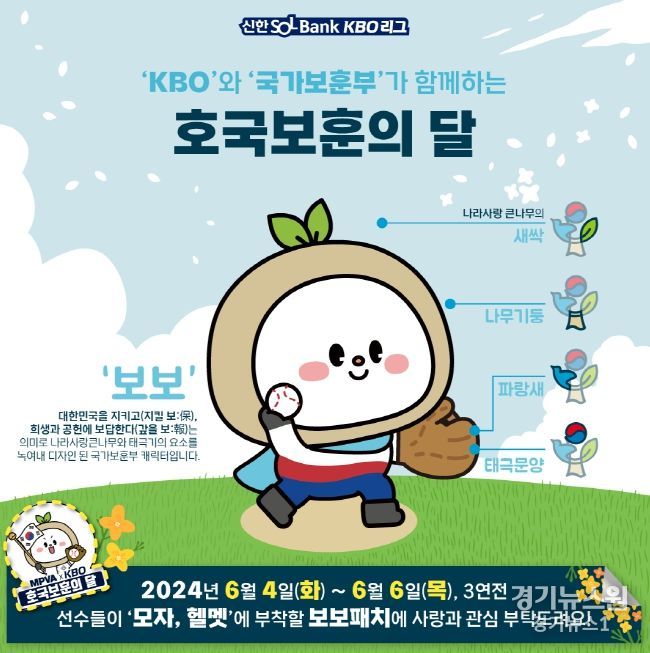 경기뉴스원(경기뉴스1) | KBO는 호국보훈의 달인 6월을 맞이해 국가보훈부와 함께 국가유공자에 대한 예우와 존경을 표시하고, 나라를 사랑하는 마음을 고취하기 위해 보훈 캐릭터인 ‘보보(保報)’ 패치 달기 캠페인을 진행한다.