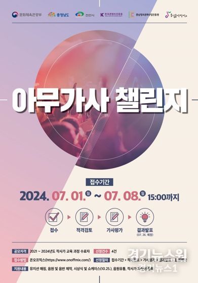 경기뉴스원(경기뉴스1) | 충남음악창작소가 창작콘텐츠 제작을 위해 ‘아무가사 챌린지 공모전’을 개최한다고 1일 밝혔다.