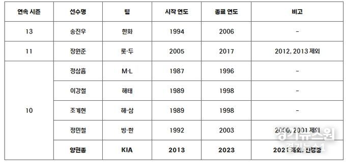 이와 함께 이번 시즌 91 2/3이닝을 던진 양현종은 KBO 통산 3번째로 11시즌 연속 100이닝 투구 기록 달성도 눈앞에 두고 있다. 앞으로 8 1/3이닝만 채우면 송진우(전 한화), 장원준(전 두산)만이 보유하고 있던 기록에 7년 만에 3번째로 이름을 올리게 된다.