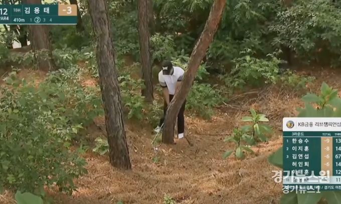 김용태는 잠깐의 고민을 한 뒤 54도 웨지로 2번째 샷을 했고 김용태의 클럽 페이스와 샤프트는 분리가 됐다. 특히 샤프트는 나무이 부딪힌 충격으로 구부러졌다. 하지만 다행히 공은 페어웨이로 잘 빠져나왔고 김용태는 3번째 샷과 퍼트까지 잘 마무리해 파를 적어냈다.