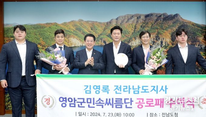 김영록 지사는 “스포츠를 사랑하는 도민에게 영암군민속씨름단은 큰 자랑거리”라며 “앞으로 씨름단이 민속씨름 제2의 전성기를 누리도록 지속 응원하겠다”고 말했다.
