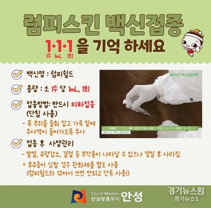 안성시(시장 김보라)는 럼피스킨 백신 자가 접종 농가 실정에 맞게 자체 제작한 정확한 럼피스킨 백신 접종 방법을 배포했다.