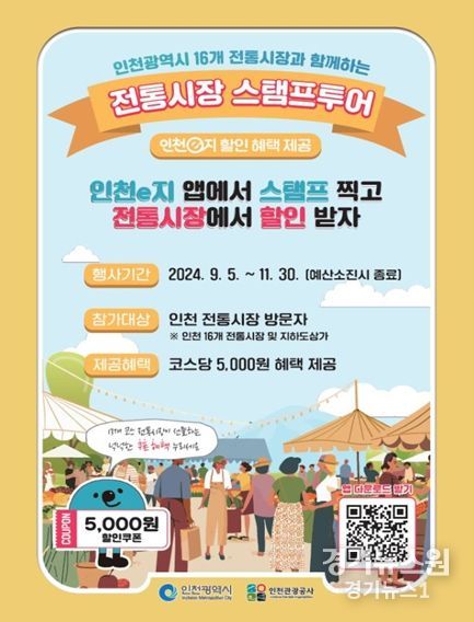 경기뉴스원(경기뉴스1) | 인천광역시와 인천관광공사는 인천의 전통시장을 알려 지역 경제 활성화를 위한 ‘매력으뜸 전통시장 육성사업’의 일환으로 9월 5일부터 11월 30일까지‘인천e지’ 앱을 활용한 모바일 스탬프 투어 이벤트를 진행한다.