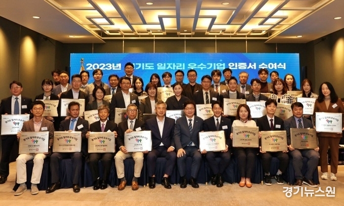 경기도는 26일 라마다플라자 수원호텔 오키드홀에서 ‘2023년 경기도 일자리 우수기업 인증서 수여식’을 열고 60개 우수기업에 인증서를 수여했다.