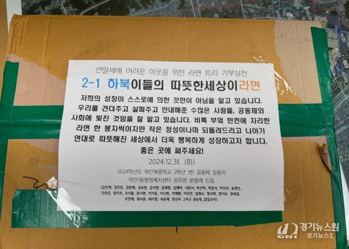 경기뉴스원(경기뉴스1) | 광명시 하안북중학교 2학년 1반 학생들은 지난 12월 31일 연말을 맞아 관내 어려운 이웃을 위해 하안1동 행정복지센터에 라면 25개를 기부했다.