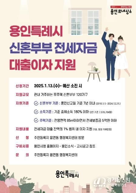 경기뉴스원(경기뉴스1) | 용인특례시는 결혼한 지 7년 이내 무주택 신혼부부의 주거 안정을 돕기 위해 최대 100만원의 전세자금 대출이자를 지원키로 하고 13일부터 31일까지 총 120쌍을 모집한다고 9일 밝혔다.
