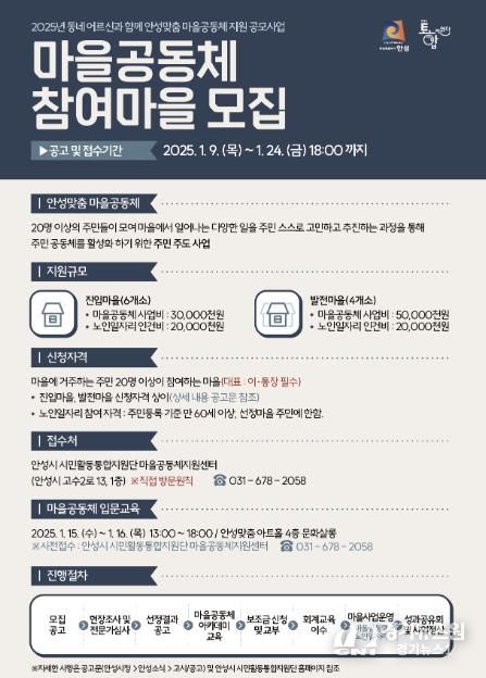 경기뉴스원(경기뉴스1) | 안성시 시민활동통합지원단 마을공동체지원센터는 9일에 ‘2025년 동네 어르신과 함께하는, 안성맞춤 마을공동체 지원 공모사업’을 공고했다.