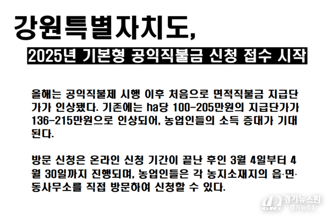 경기뉴스원(경기뉴스1) | 강원특별자치도(도지사 김진태)는 2025년 기본형 공익직불금 신청 및 접수를 2월 1일부터 시작한다고 밝혔다. 이번 신청은 온라인과 방문 두 가지 방법으로 진행되며, 농업인들에게 큰 혜택을 제공하는 중요한 기회로 주목받고 있다.