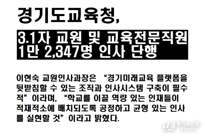 경기뉴스원(경기뉴스1) | 경기도교육청(교육감 임태희)은 4일, 오는 3월 1일 자로 교(원)장, 교(원)감, 교사, 교육전문직원 총 1만 2,347명에 대한 인사를 단행했다. 이번 인사는 경기도교육청 조직개편과 맞물려 학교의 미래교육 역량을 강화하고 교육지원청의 역할을 확립하는 데 중점을 두었다.