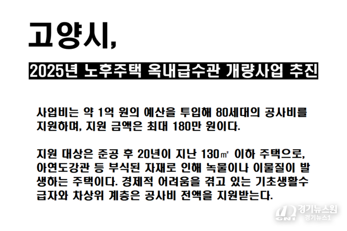 경기뉴스원(경기뉴스1) | 고양특례시(시장 이동환)는 2025년 노후 주택의 녹물 문제 해결을 위해 '노후주택 옥내급수관 개량사업'을 추진한다고 4일 밝혔다.