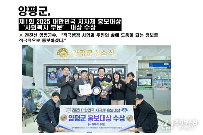 경기뉴스원(경기뉴스1) | 양평군(군수 전진선)은 5일 (사)한국미디어영상교육진흥원이 주최하는 제1회 2025 대한민국 지자체 홍보대상에서 ‘사회복지 부문’ 대상을 수상했다고 밝혔다.