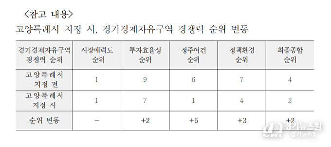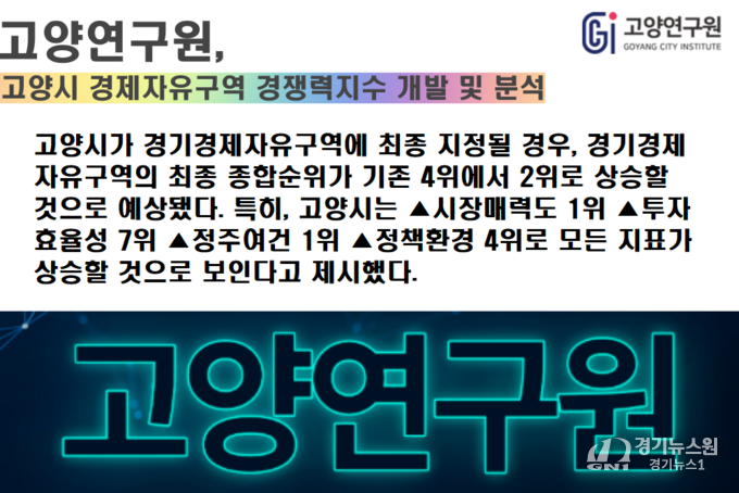고양연구원은 고양시가 이미 높은 경쟁력을 확보하고 있으며, 경기경제자유구역에 지정될 경우 고양시뿐만 아니라 경기경제자유구역 전체에 긍정적인 영향을 미칠 것으로 전망했다. 이를 위해 고양시는 지역경제 활성화와 고급 인력 및 우수한고양시가 경기경제자유구역에 최종 지정될 경우, 경기경제자유구역의 최종 종합순위가 기존 4위에서 2위로 상승할 것으로 예상됐다. 특히, 고양시는 ▲시장매력도 1위 ▲투자효율성 7위 ▲정주여건 1위 ▲정책환경 4위로 모든 지표가 상승할 것으로 보인다고 제시했다. 정주여건을 결합한 전략을 극대화해야 한다고 제언했다.
