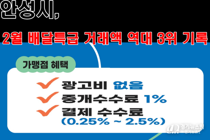 경기뉴스원(경기뉴스1) | 안성시는 2월 한 달 동안 배달특급 거래액이 2억7,900만 원을 기록하며 역대 세 번째로 높은 실적을 달성했다고 밝혔다. 이는 전년 동월 대비 75% 증가한 수치다.