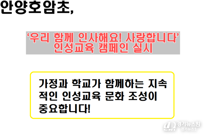 【안양=경기뉴스원/경기뉴스1】 | 안양호암초등학교(교장 안희정)는 4월 29일, 인성교육 실천주간을 맞아 ‘우리 함께 인사해요! 사랑합니다’ 캠페인을 진행했다.