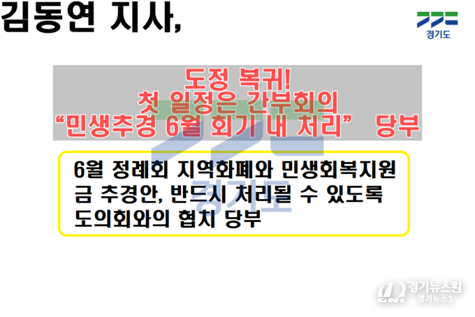 김 지사는 “정치 일정으로 잠시 자리를 비웠지만 도정을 소홀히 한 적은 없다”며 “이제는 본격적으로 현안을 챙기고, 마무리할 일은 책임 있게 마무리하겠다”고 밝혔다. 그는 특히 6월 정례회에서 지역화폐와 민생회복지원금이 포함된 추경안이 반드시 처리될 수 있도록 도의회와의 협치를 당부했다.