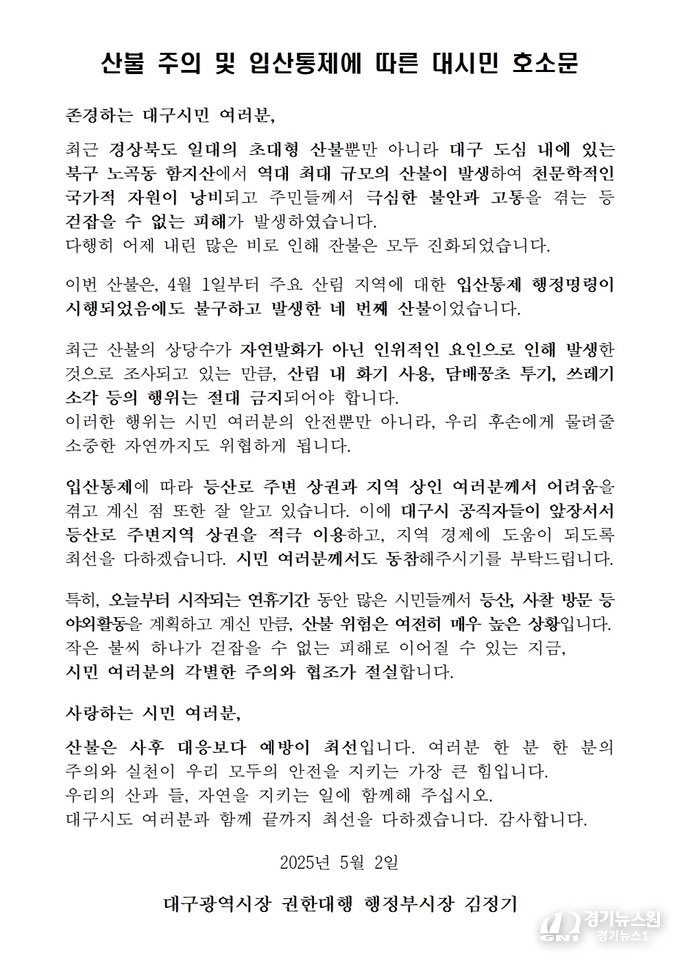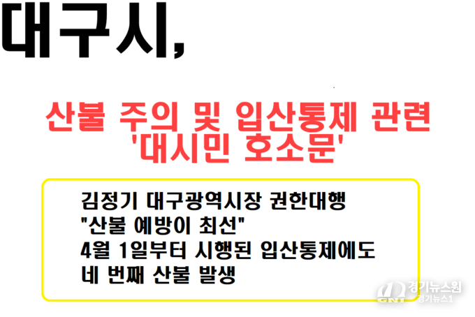 【대구=경기뉴스원/경기뉴스1】 | 대구시는 최근 경북 및 대구 북구 노곡동 함지산에서 발생한 대형 산불로 큰 피해가 발생했다고 전했다. 다행히 많은 비로 잔불은 진화됐으나, 이번 산불은 4월 1일부터 시행된 입산통제에도 불구하고 발생한 네 번째 산불이었다.