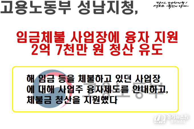 【성남=경기뉴스원/경기뉴스1】 | 고용노동부 성남지청(지청장 양승준)은 2025년도 제1차 현장 예방점검을 통해 임금 등을 체불하고 있던 정보통신업체 등 2개 사업장에 대해 사업주 융자제도를 안내하고, 총 2억 7천만 원의 체불금 청산을 지원했다고 14일 밝혔다.