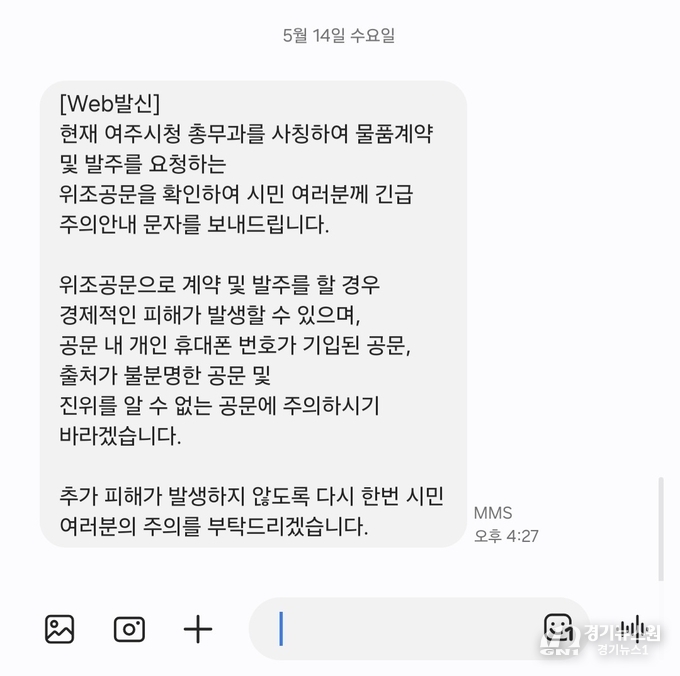 [여주=경기뉴스원/경기뉴스1] | 최근 여주시청 총무과를 사칭해 물품 계약 및 발주를 요청하는 위조 공문이 확인돼, 여주시가 시민들을 대상으로 긴급 주의 안내 문자를 발송했다.