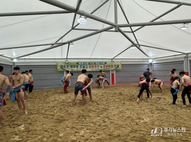 [경기뉴스원/경기뉴스1] | 광주시청 직장운동경기부 씨름팀이 지역 내 초·중·고 씨름 꿈나무들을 대상으로 특별 재능기부 훈련을 열었다.