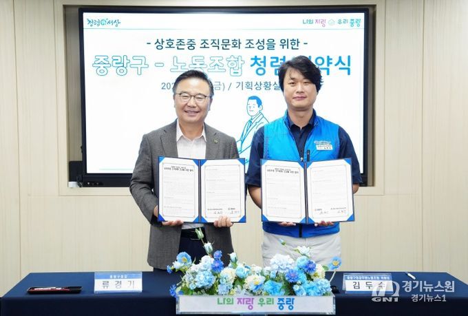 [경기뉴스원/경기뉴스1] | 중랑구는 8월 22일 중랑구노동조합과 함께 ‘청렴, 같이 말해요’ 협약을 체결하고, 직원 대표들과 자유로운 분위기 속 간담회를 진행했다.