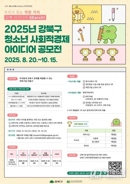 [경기뉴스원/경기뉴스1] | 서울 강북구는 청소년의 창의적인 시각으로 지역사회 문제를 발굴하고, 사회적경제 활성화 방안을 모색하기 위해 ‘강북구 청소년 사회적경제 아이디어 공모전-강북 아이디어 SEarch!’를 개최한다고 밝혔다.