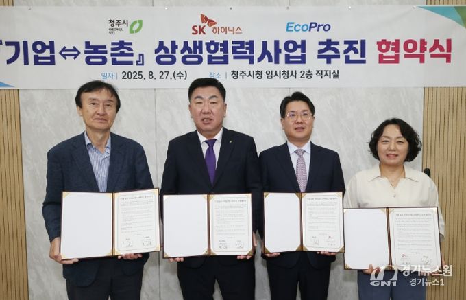 [경기뉴스원/경기뉴스1] | 청주시는 27일 지역 기업인 SK하이닉스㈜, ㈜에코프로와 기업과 농촌 간 상생협력 발전을 위한 업무협약을 체결했다.