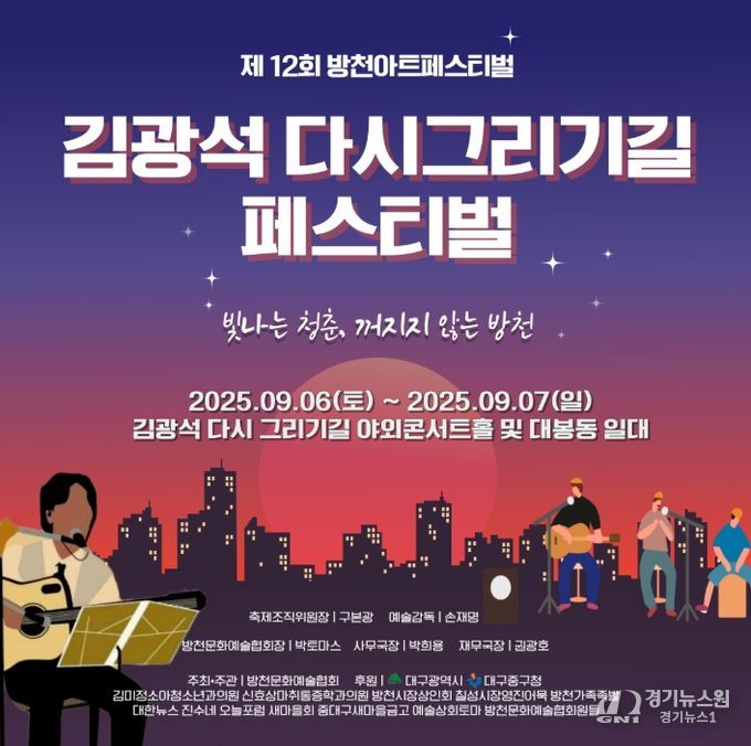 [경기뉴스원/경기뉴스1] | 대구 중구는 9월 6일부터 7일까지 양일간 김광석다시그리기길과 방천시장 일원에서 ‘2025 김광석다시그리기길 페스티벌(제12회 방천아트페스티벌)’을 개최한다.