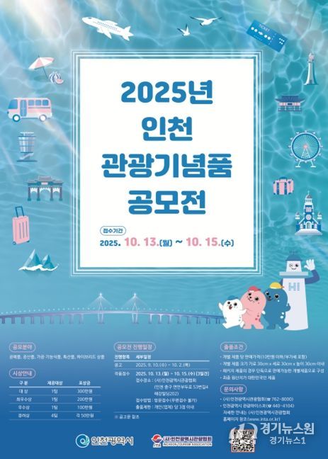 [경기뉴스원/경기뉴스1] | 인천광역시는 인천을 찾는 국내외 관광객들에게 오래도록 기억에 남을 특별한 추억을 선사할 수 있도록, 인천만의 고유한 특성을 담은 실용적인 관광기념품을 발굴하기 위해 ‘2025년 인천 관광기념품 공모전’을 개최한다고 밝혔다.