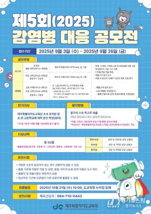 [경기뉴스원/경기뉴스1] | 제주특별자치도교육청은 오는 26일까지 학생들이 안전하고 건강한 학교와 사회를 만들 방법을 스스로 생각하고 실천할 수 있는 기회를 제공하기 위해 ‘제5회 감염병 대응 공모전’을 개최한다.