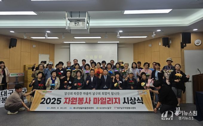 [경기뉴스원/경기뉴스1] | 대구 남구는 대구 남구자원봉사센터(센터장 이창지)와 함께 지난 9월 24일, '2025 자원봉사 마일리지 시상식'을 열고 한 해와 오랜 세월 동안 지역사회를 위해 헌신해 온 우수 자원봉사자들에게 인증메달, 공로패, 핸드프린팅을 수여했다.