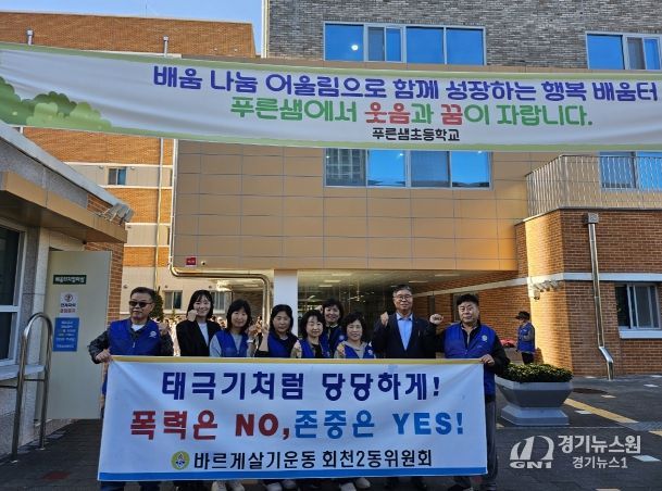 [경기뉴스원/경기뉴스1] | 양주시 바르게살기운동 회천2동위원회(위원장 황영학)가 16일 푸른샘초등학교 앞에서 학생들을 대상으로 학교폭력 예방 캠페인을 실시했다.