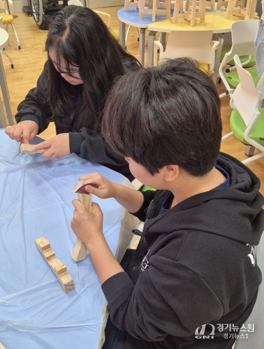 이날(17일)은 도내 중학생 20명(특수교육대상학생 10명, 비장애학생 10명)이 특수교육원을 방문해 목공 체험에 참여했다.