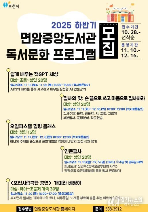 [경기뉴스원/경기뉴스1] | 포천시 면암중앙도서관은 오는 11월 16일부터 하반기 독서문화프로그램을 운영한다.
