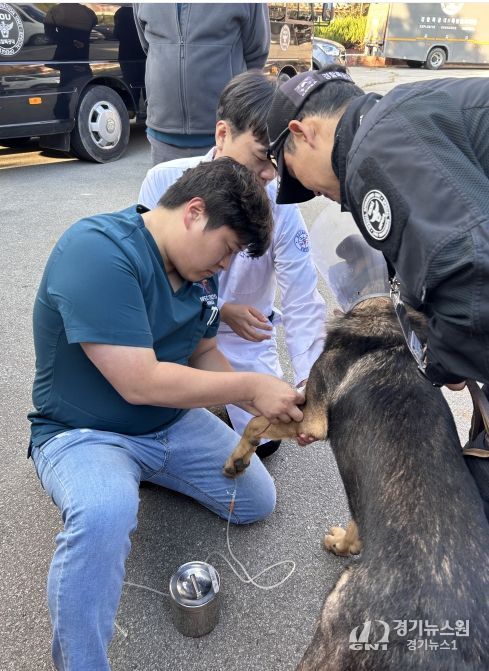 [경기뉴스원/경기뉴스1] | 경상국립대학교 수의과대학 이동빈 연구부학장을 비롯해 졸업 동문, 대학원생 등 5명이 경주 아시아태평양경제협의체(APEC) 정상회의에 파견된 경찰견 50마리를 위한 ‘현장 의료지원팀’으로 활동해 화제가 되고 있다.
