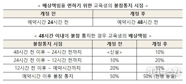 또한 종전 표준약관에 따를 때 교육생은 수업 예약시간 24시간 전에만 불참을 통지하면 면책됐으나, 학원 입장에서 24시간 이내에 노쇼로 발생한 예약 공백을 대체할 교육생을 구하기란 현실적으로 어렵고, 결국 그 시간 동안 학원과 강사는 일방적으로 손해를 감수해야 하는 불합리함이 있었다. 따라서 공정위는 이번 개정을 통하여 면책의 기준이 되는 불참통지 시기를 예약시간 48시간 전으로 늘리고, 아래와 같이 시간단계별로 배상책임을 차등화하여 소비자의 노쇼 방지를 유도하고자 했다.