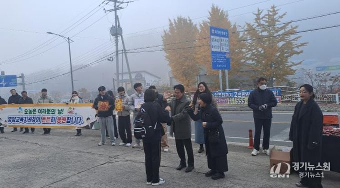 [경기뉴스원/경기뉴스1] | 경상북도영양교육지원청은 2025년 11월 13일 오전 7시 10분부터 영양여자중·고등학교 정문에서 2026학년도 대학수학능력시험에 응시하는 수험생을 대상으로 수험생 응원 행사를 진행했다.
