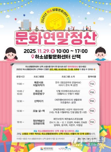 [경기뉴스원/경기뉴스1] | 제천문화재단(이사장 김상수)은 오는 29일 하소생활문화센터 산책에서 한 해 동안 시민과 함께 걸어온 다양한 프로그램을 한자리에서 만나는 '문화연말정산'을 운영한다고 밝혔다.