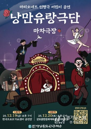 [경기뉴스원/경기뉴스1] | (재)영암문화관광재단은 연말을 맞아 영암군 어린이와 가족을 위한 마리오네트 인형극 어린이 공연 '낭만유랑극단:마차극장'을 오는 12월 19일 오후 7시에 한국트로트가요센터 공연장과 12월 20일(토) 오후 7시에 삼호종합문화체육센터 대회의실에서 개최한다.