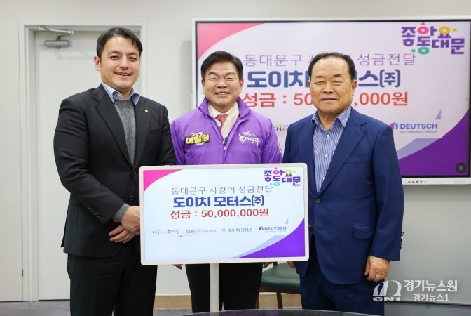 [경기뉴스원/경기뉴스1] | 서울 동대문구는 도이치모터스로부터 사랑의 성금 5000만원을 전달받았다고 밝혔다. 도이치모터스가 2011년부터 올해까지 15년째 이어온 기부는 2011~2024년 누적 2억6500만원에 달하며, 올해도 5000만원을 보태 지역 나눔을 이어갔다.