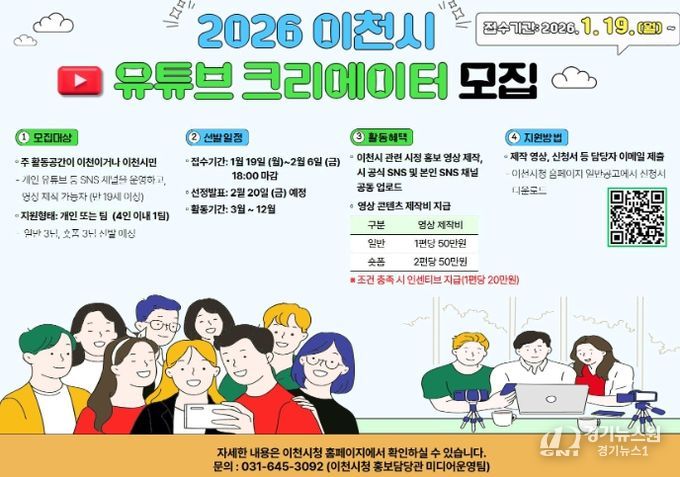 [경기뉴스원/경기뉴스1] | 이천시는 오는 2월 6일까지 2026년 이천시 유튜브 영상크리에이터 3기를 모집한다고 9일 밝혔다.