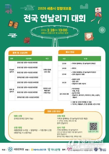 세종특별자치시는 세종문화원 주관으로 ‘2026년 세종시 정월대보름 전국 연날리기 대회’ 참여자를 모집한다고 밝혔다.