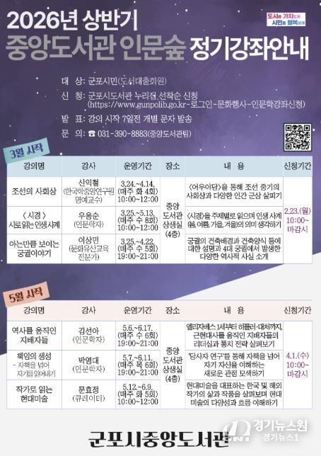 [경기뉴스원/경기뉴스1] | 군포시중앙도서관은 시민의 인문학적 소양을 함양하고 공동체적 성찰의 기회를 확대하고자 ‘중앙도서관 인문숲’ 상반기 강좌를 운영한다.