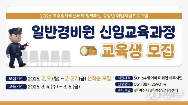 [경기뉴스원/경기뉴스1] | 여주시는 중장년층의 재취업을 돕기 위해 2026년 여주시 중장년 일반경비원 신임교육과정 교육생을 모집한다고 밝혔다.