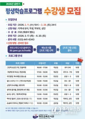 [경기뉴스원/경기뉴스1] | 화천교육도서관은 화천군민을 대상으로 3월 17일부터 6월 20일까지 ‘2026년 상반기 평생학습프로그램’을 운영한다고 밝혔다.