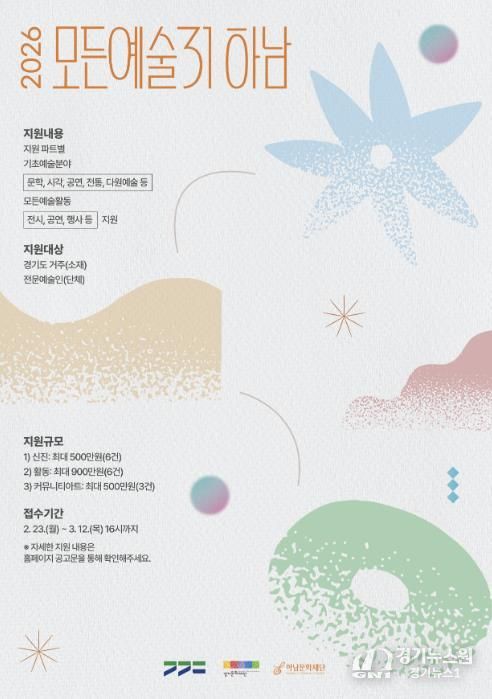 2026 경기예술활동지원 ‘모든예술31’은 경기도 31개 시·군의 지역 예술 생태계 활성화를 위해 추진되는 사업으로 기초예술분야(문학·시각·공연·전통 등)의 다양한 예술 활동을 폭넓게 지원한다.