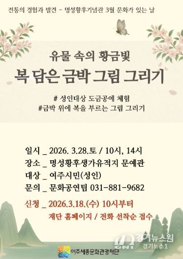 [경기뉴스원/경기뉴스1] | 여주세종문화관광재단은 오는 3월 28일, 명성황후기념관 3월 문화가 있는 날 프로그램으로 '유물 속의 황금빛, 복 담은 금박 그림 그리기'를 진행한다.