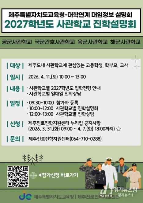 [경기뉴스원/경기뉴스1] | 제주특별자치도교육청은 정예 장교를 꿈꾸는 도내 수험생에게 진학 정보를 제공하기 위해 ‘제주특별자치도교육청-사관학교 연계 2027학년도 진학설명회’를 4월 11일 오전 10시 제주특별자치도교육청 본관 4층 대회의실에서 개최한다.