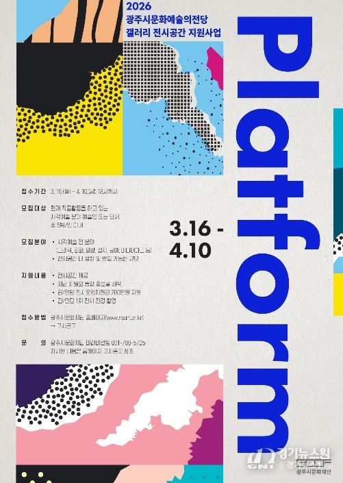 [경기뉴스원/경기뉴스1] | (재)광주시문화재단은 ‘2026 광주시문화예술의전당 갤러리 전시공간지원사업 'Platform'’ 참여 작가를 4월 10일까지 공모한다.