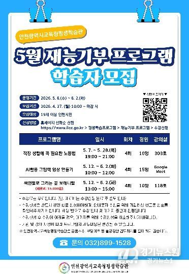 [경기뉴스원/경기뉴스1] | 인천광역시교육청평생학습관은 오는 27일부터 시민의 재능을 나누는 ‘재능기부 프로그램’ 학습자를 모집한다.