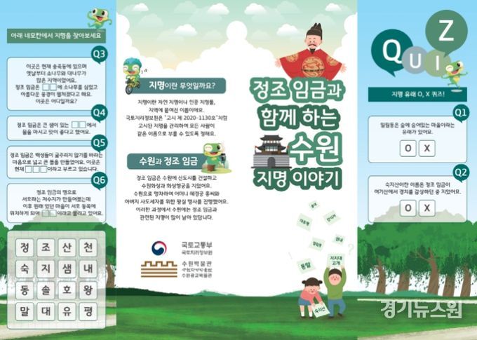 수원시 박물관사업소와 국토지리정보원이 협업해 정조대왕과 관련된 수원지역 지명의 숨은 이야기, 유래를 소개하는 홍보물 ‘정조 임금과 함께하는 수원 지명 이야기’를 제작했다.